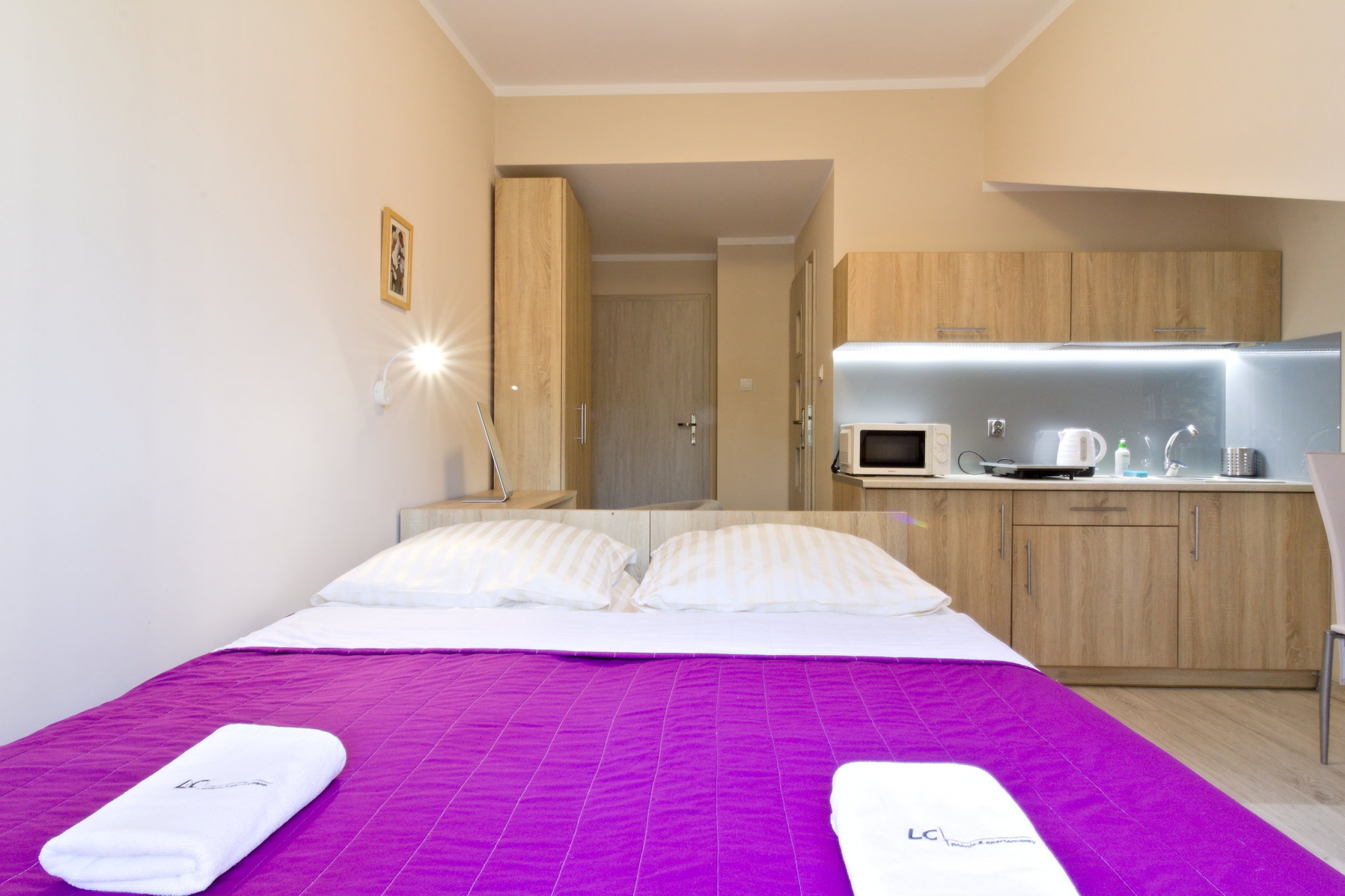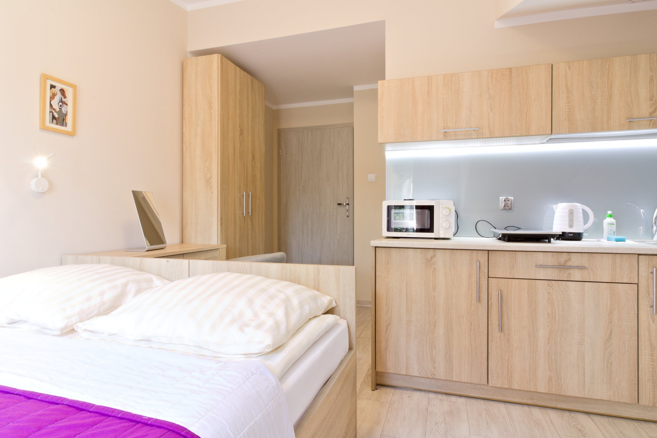 W głębi pokoju wydzielono aneks kuchenny.
