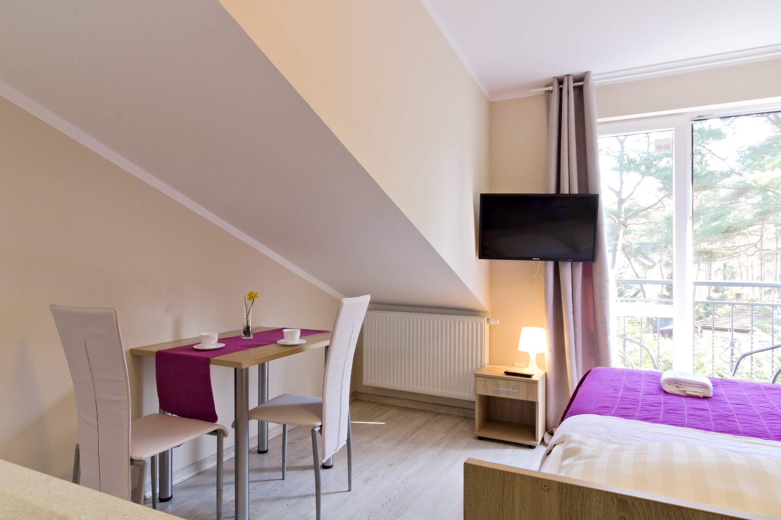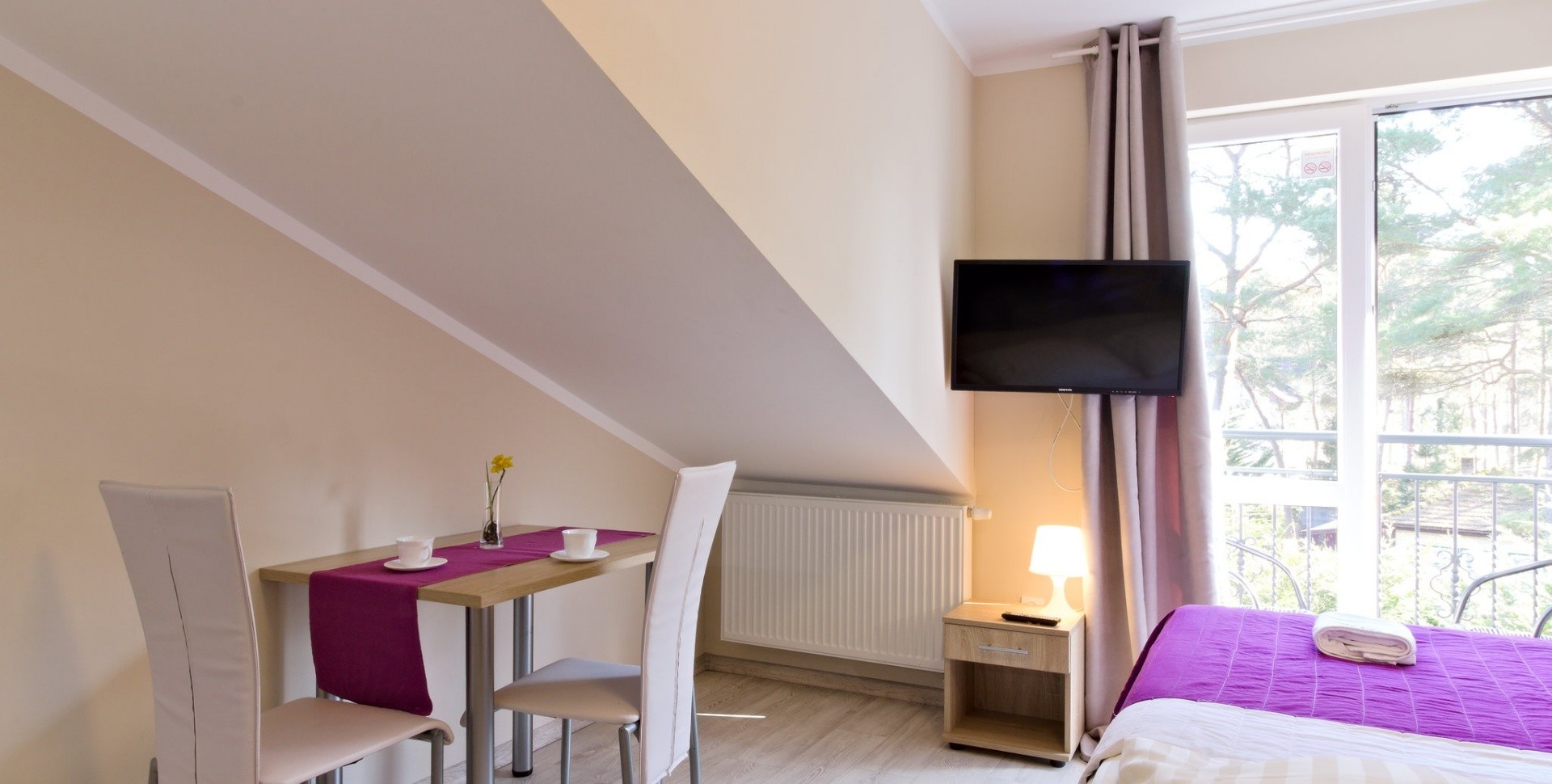 Pokój dwuosobowy zlokalizowany na drugim piętrze, skosy dachu zapewniają ciekawą architekturę, nie ograniczając przy tym funkcjonalności pokoju.