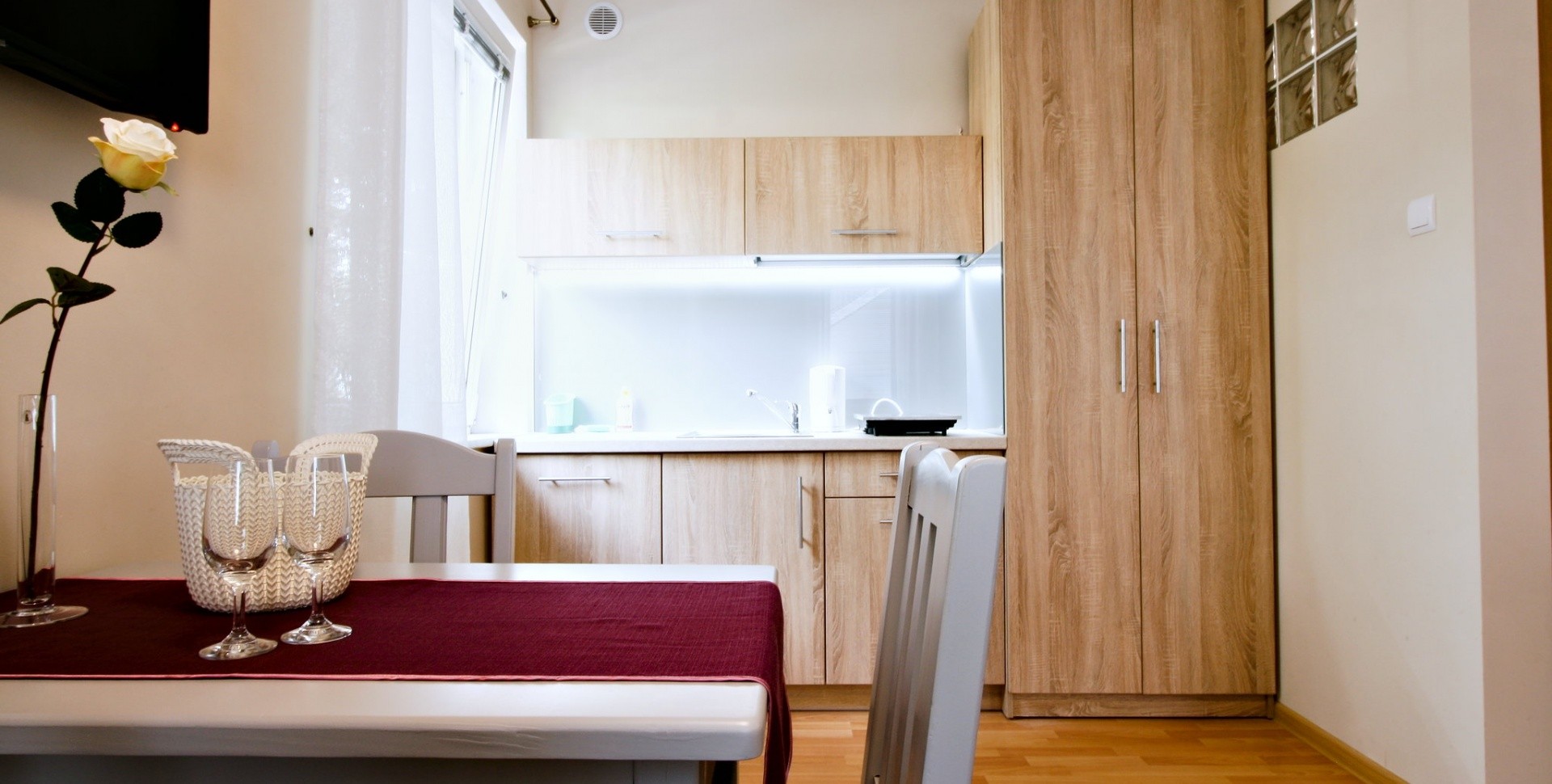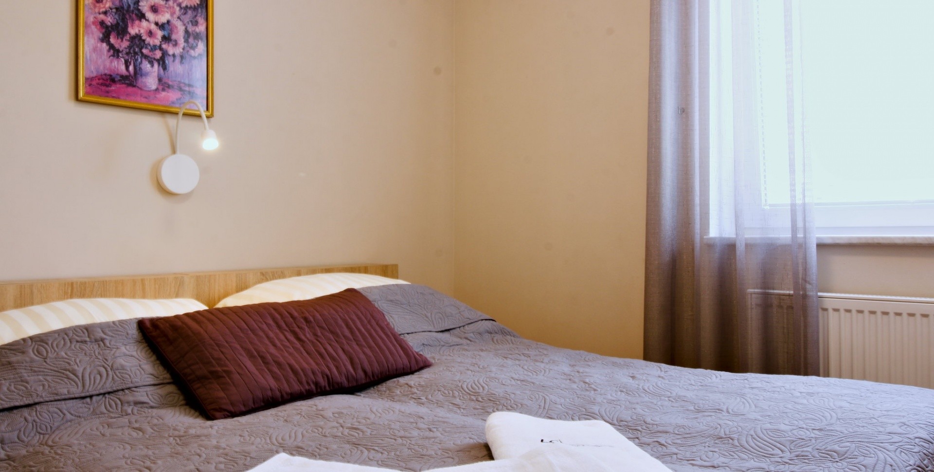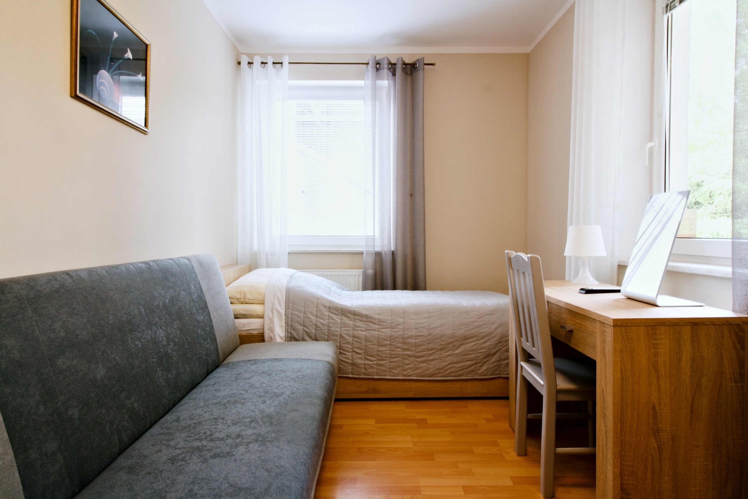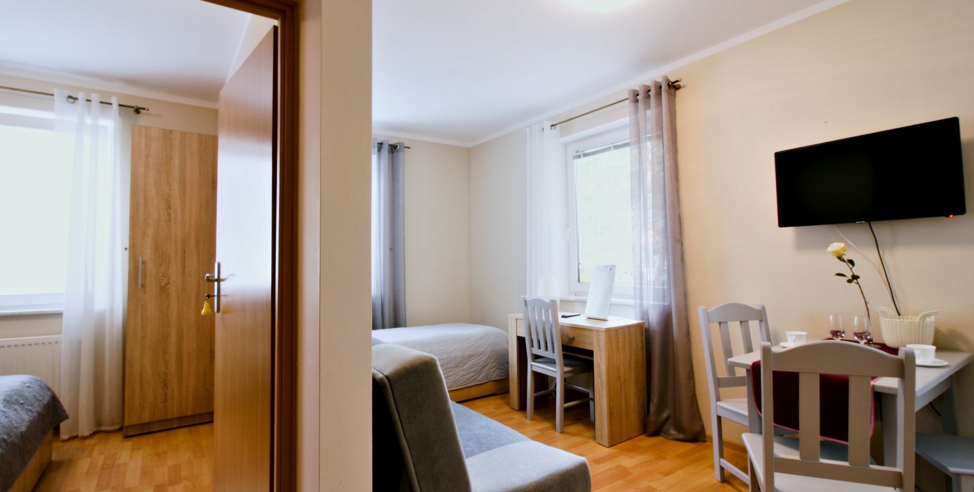 Studio z wydzieloną częścią dzienną oraz osobną sypialnią, przeznaczoną dla dwóch osób. Jeżeli potrzebujesz odrobinę więcej prywatności, to jest propozycja właśnie dla Ciebie! W części dziennej znajduje się łóżko pojedyncze oraz rozkładana sofa. W głębi części dziennej wydzielono aneks kuchenny.
