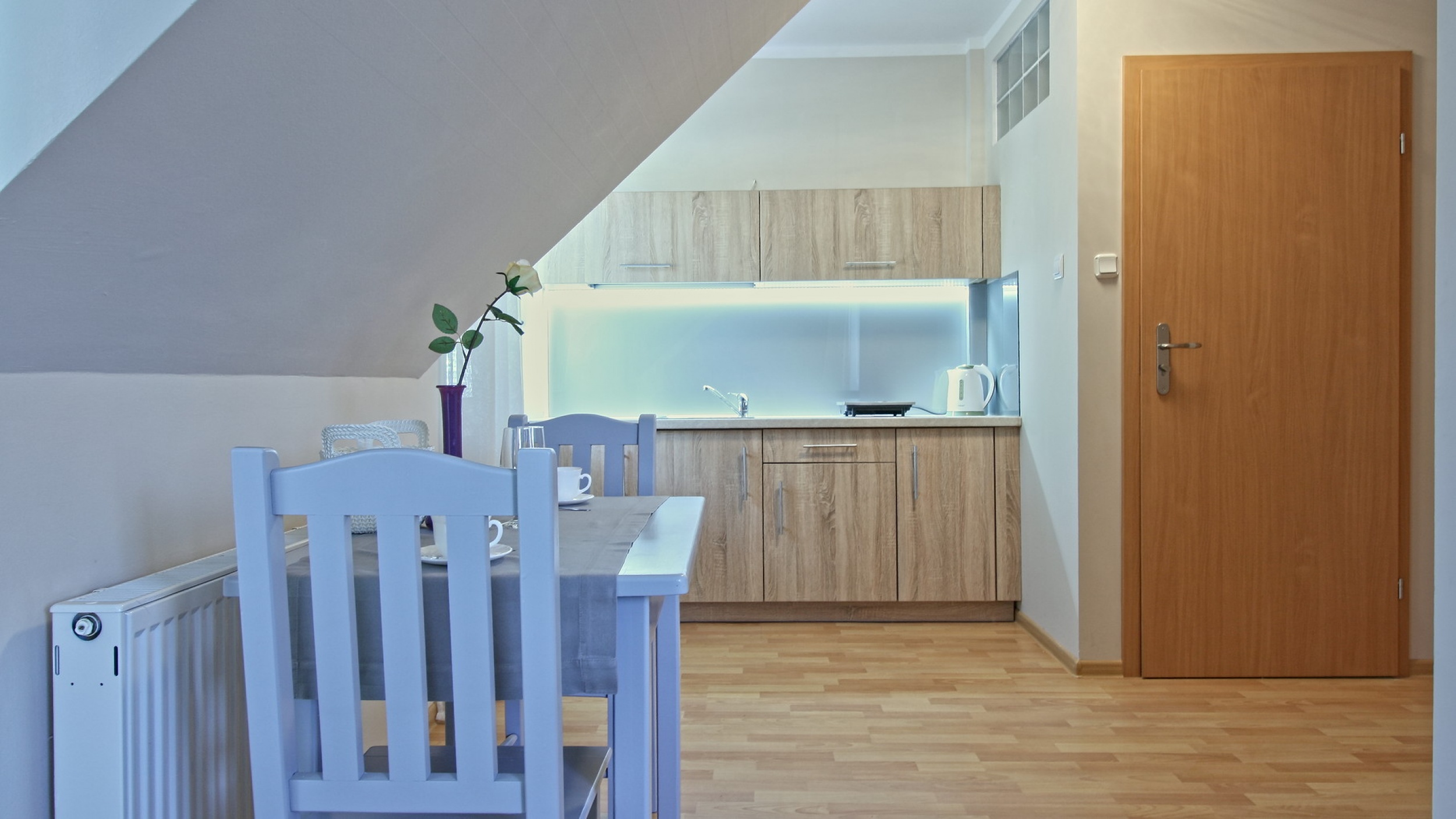Pokój 3-osobowy wyposażony w dwa łóżka pojedyncze oraz rozkładaną sofę. Idealny wybór dla rodziców ze starszymi dziećmi.