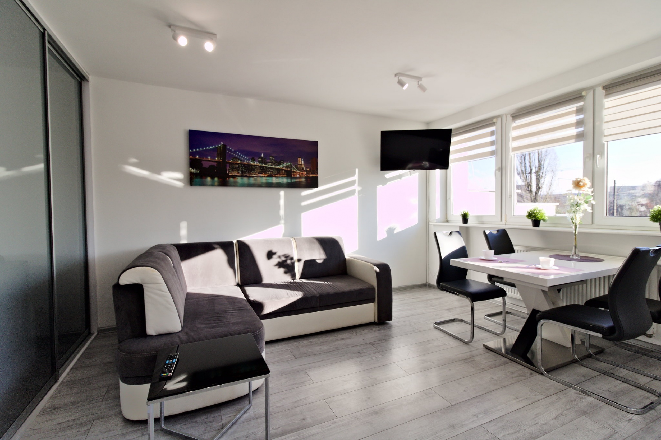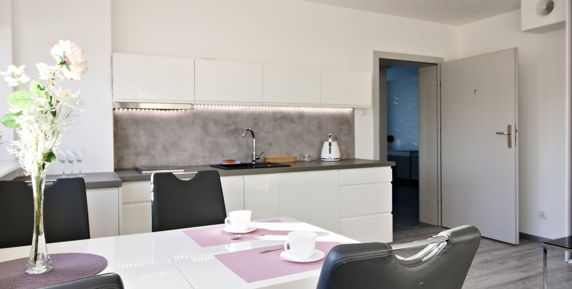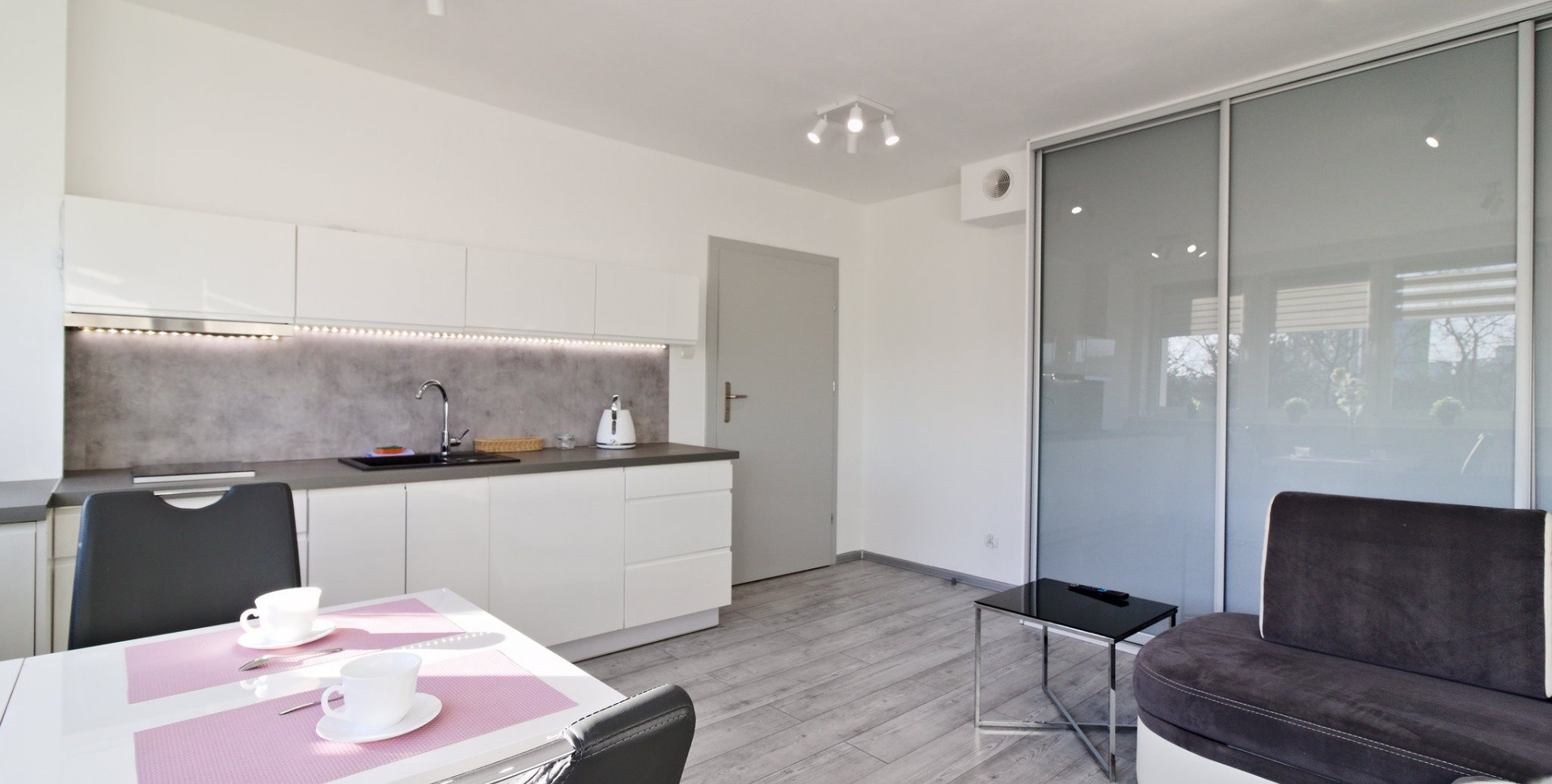 Apartament zlokalizowany jest w nowocześnie urządzonym budynku biurowo-usługowym. Na parterze znajduje się butik z modą damską (M.Choice). Apartament znajduje się na drugim piętrze, gdzie do dyspozycji gości oddaliśmy cały poziom. W skład apartamentu wchodzi osobna sypialnia z dużym łóżkiem podwójnym oraz pokój dzienny z aneksem.