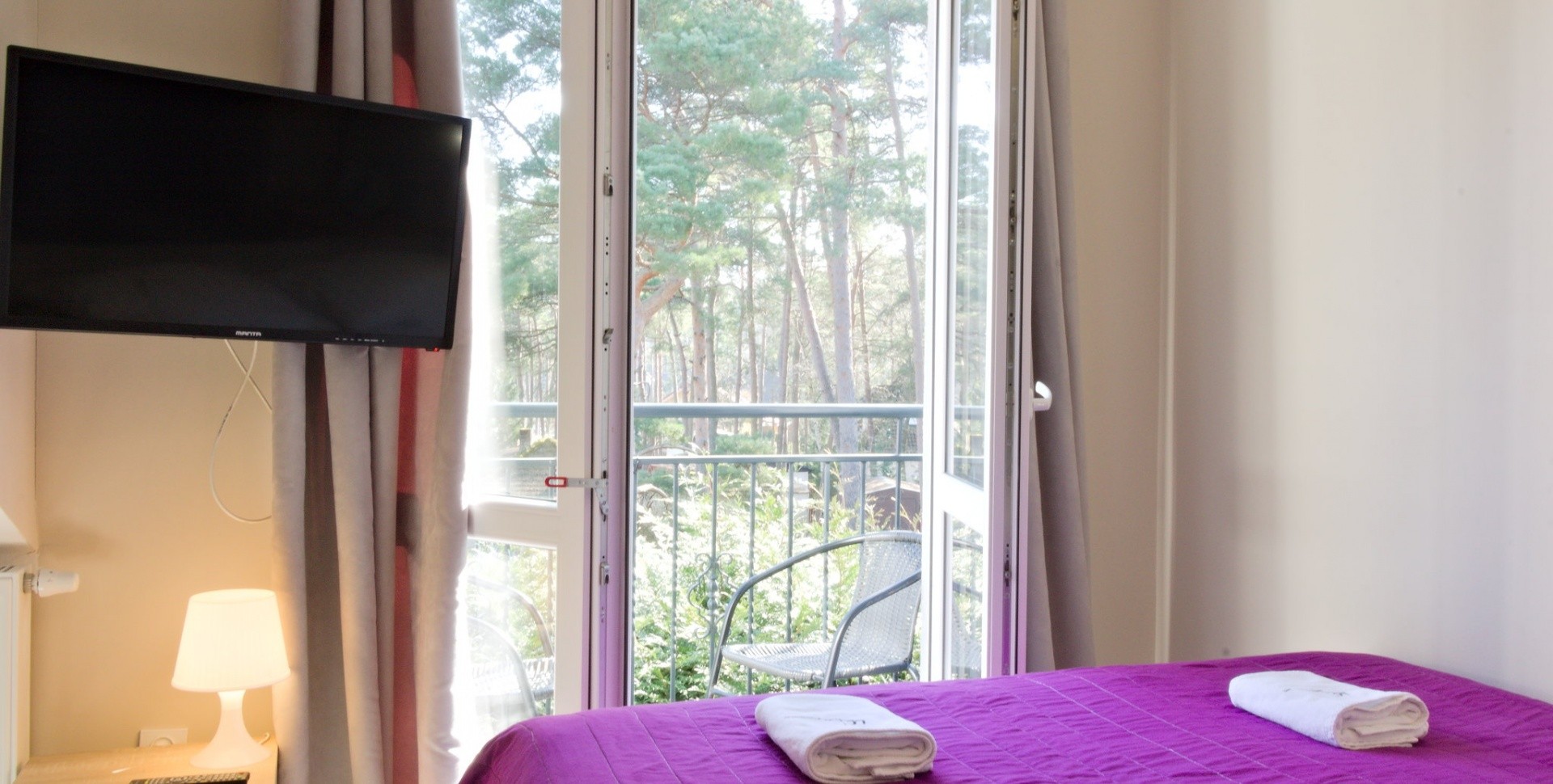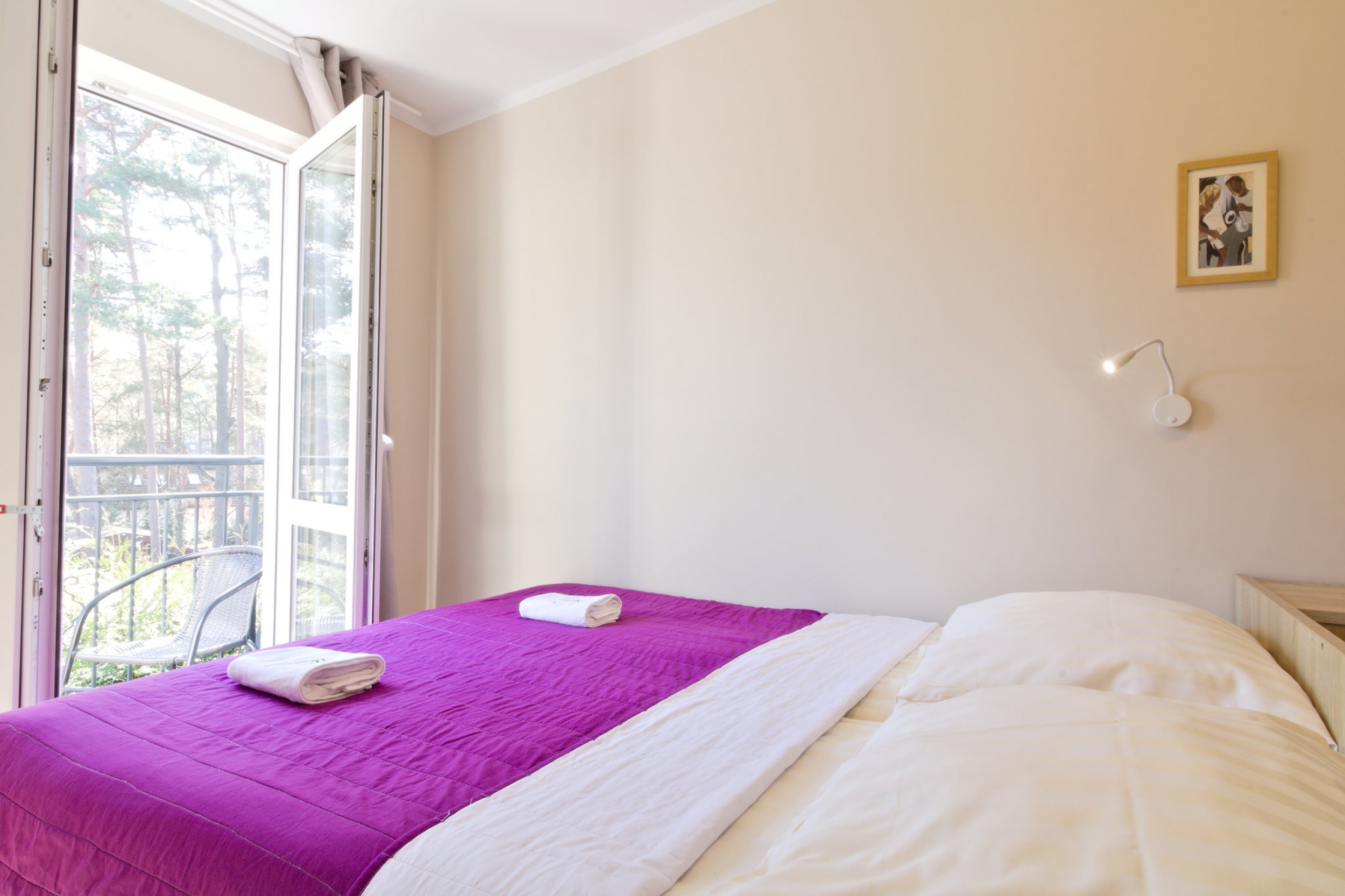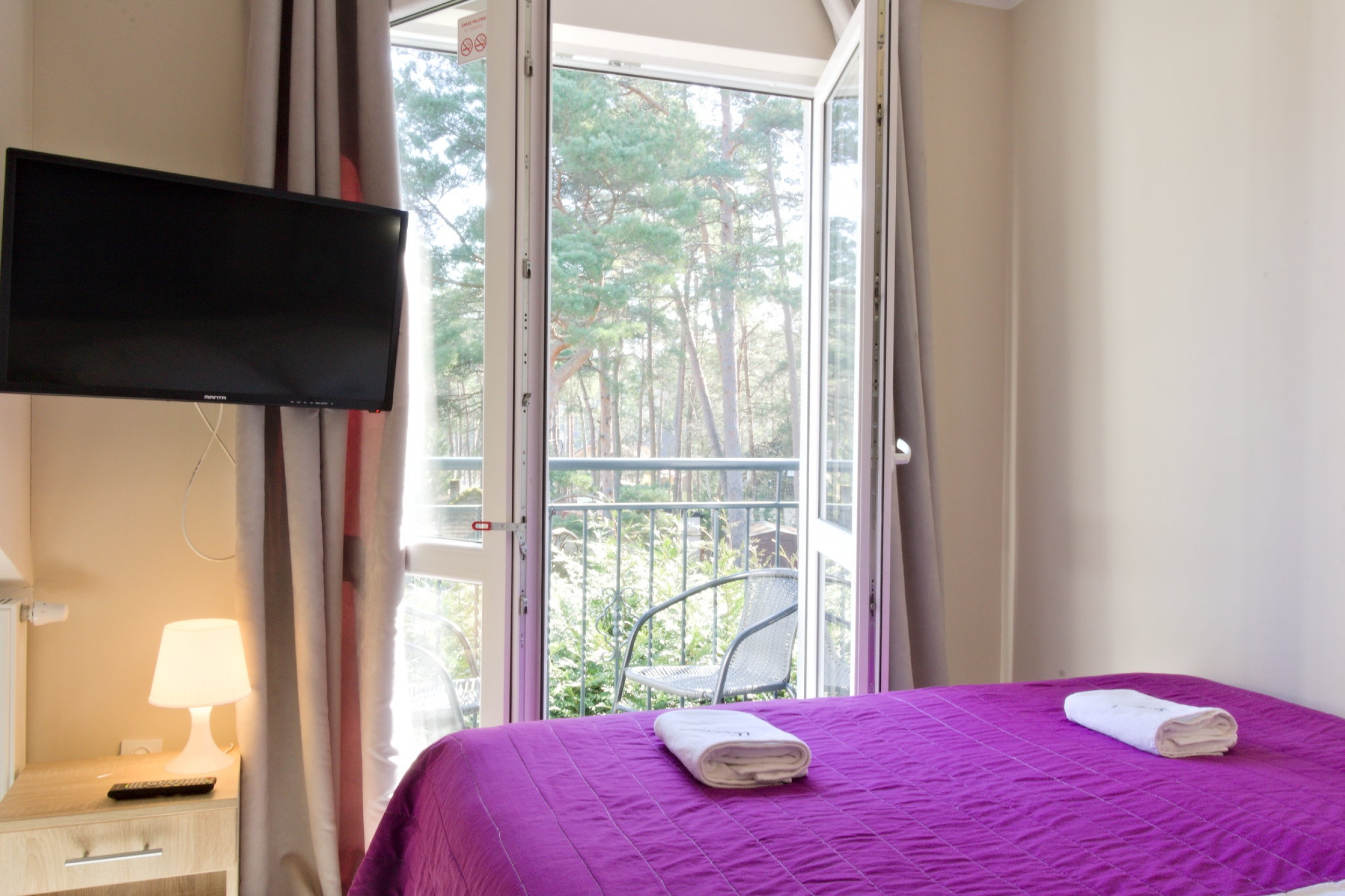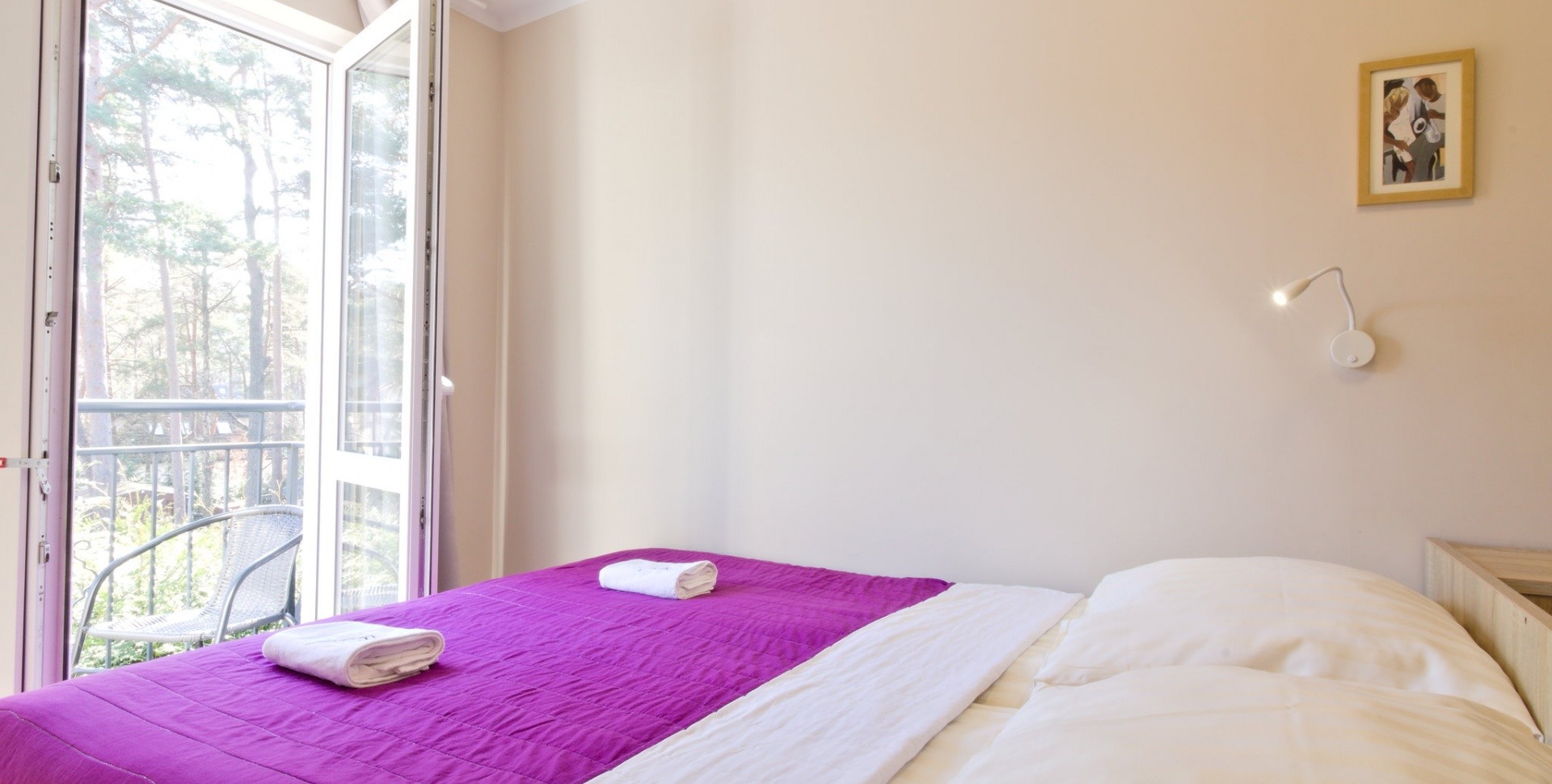 Dwa łóżka pojedyncze zsunięto razem i ustawiono na wprost wyjścia na balkon z widokiem na korony drzew.