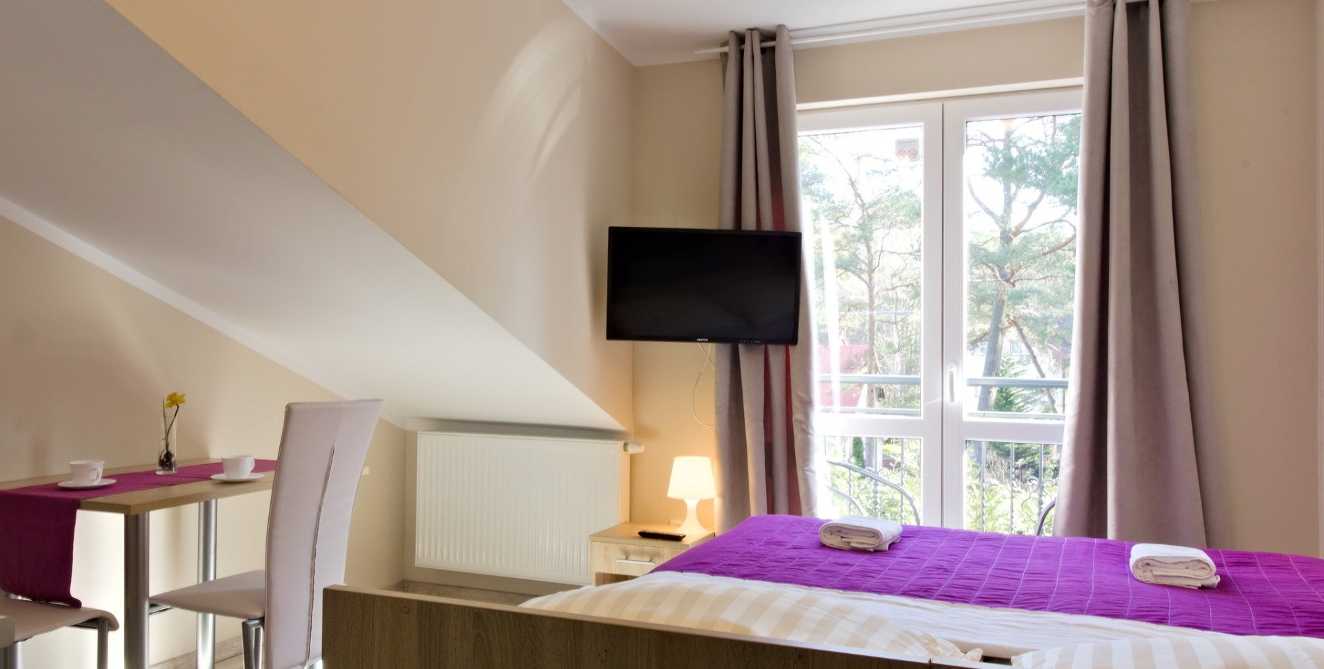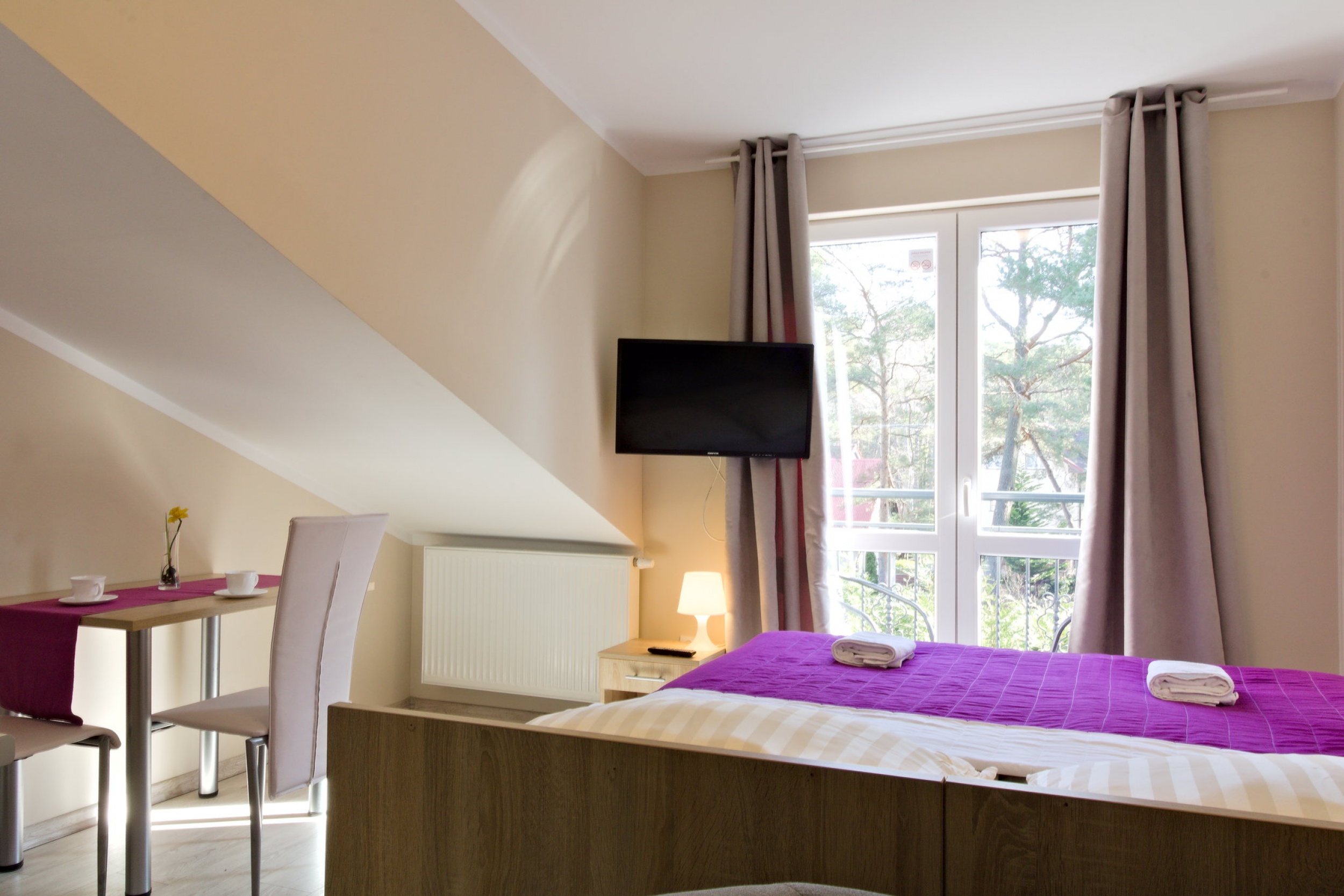 Pokój dwuosobowy zlokalizowany na drugim piętrze, skosy dachu zapewniają ciekawą architekturę, nie ograniczając przy tym funkcjonalności pokoju.