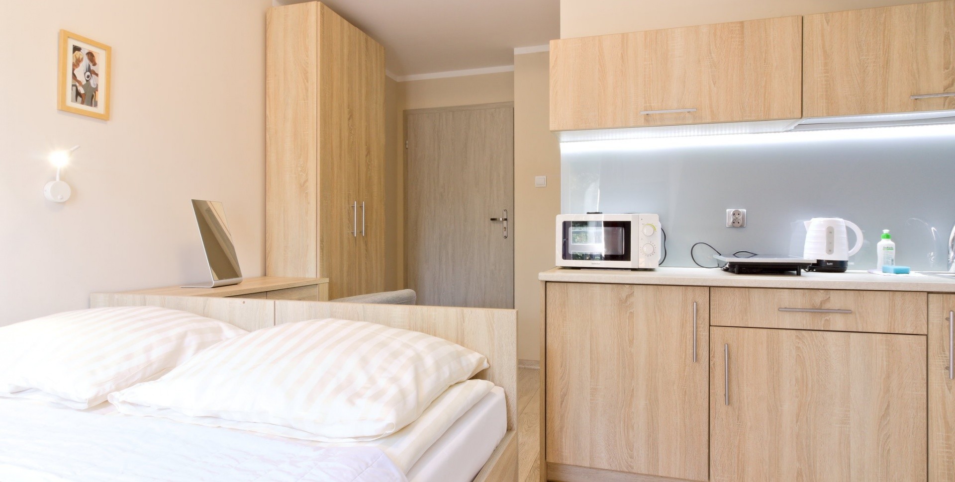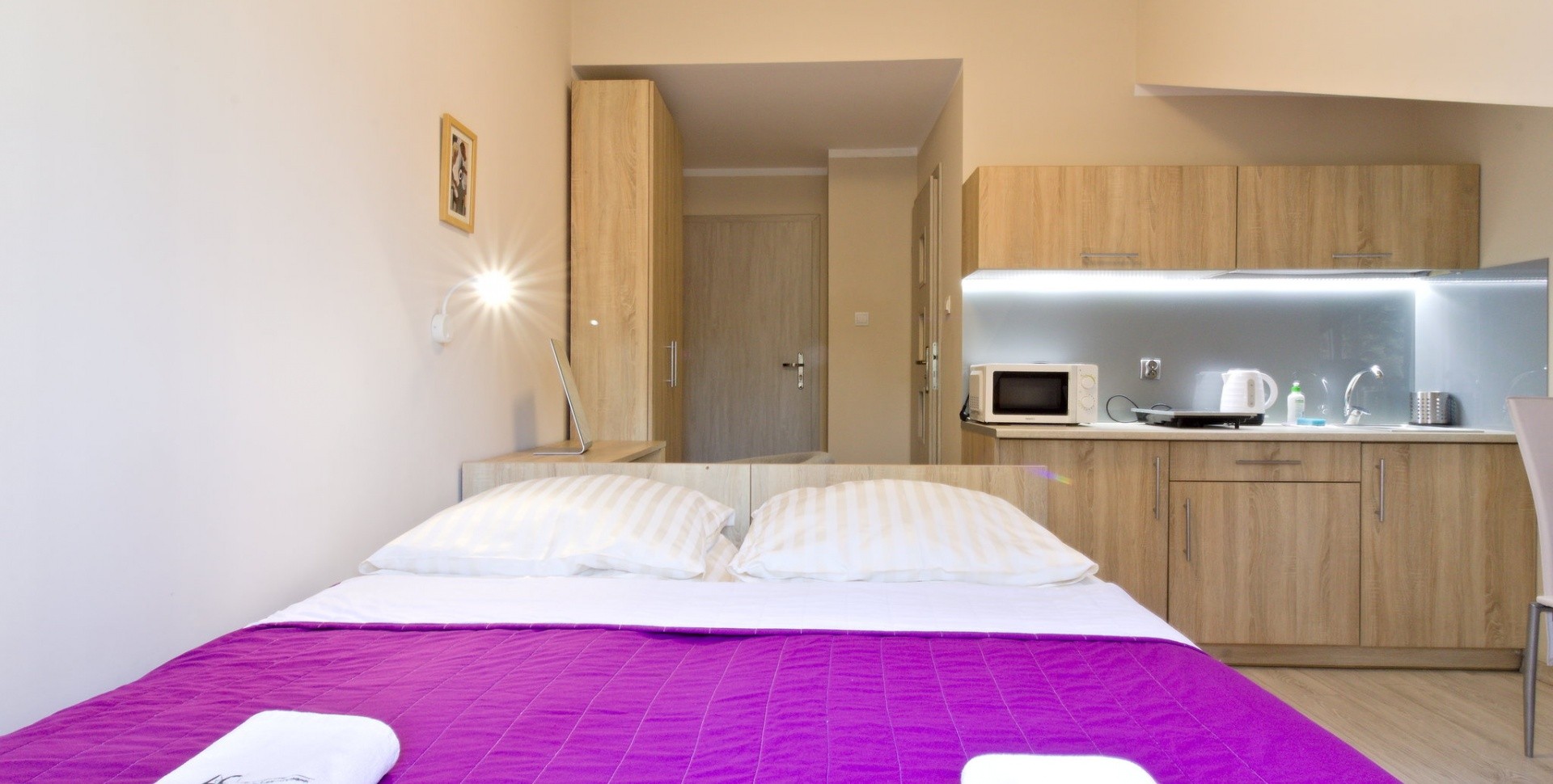 W głębi pokoju wydzielono aneks kuchenny.