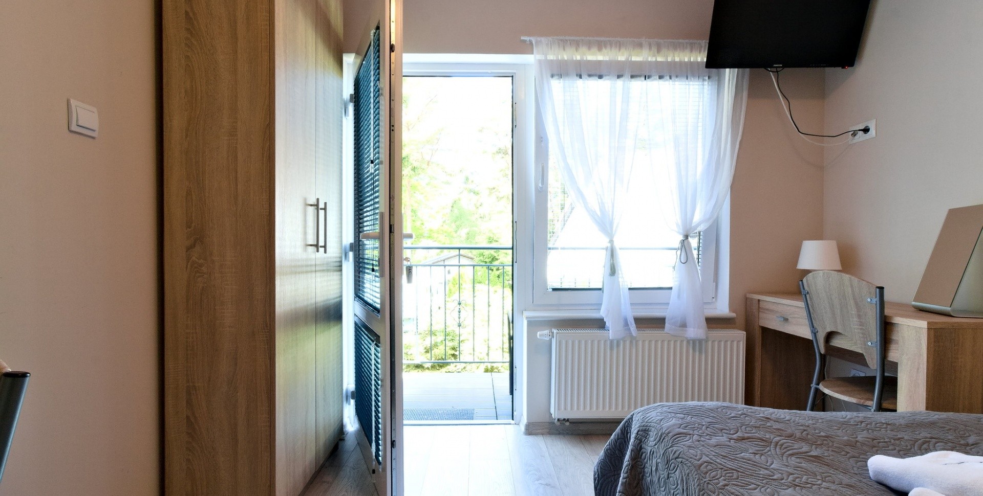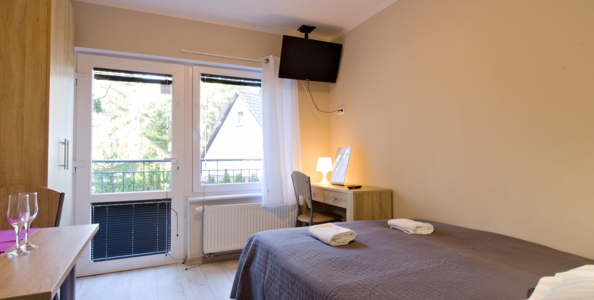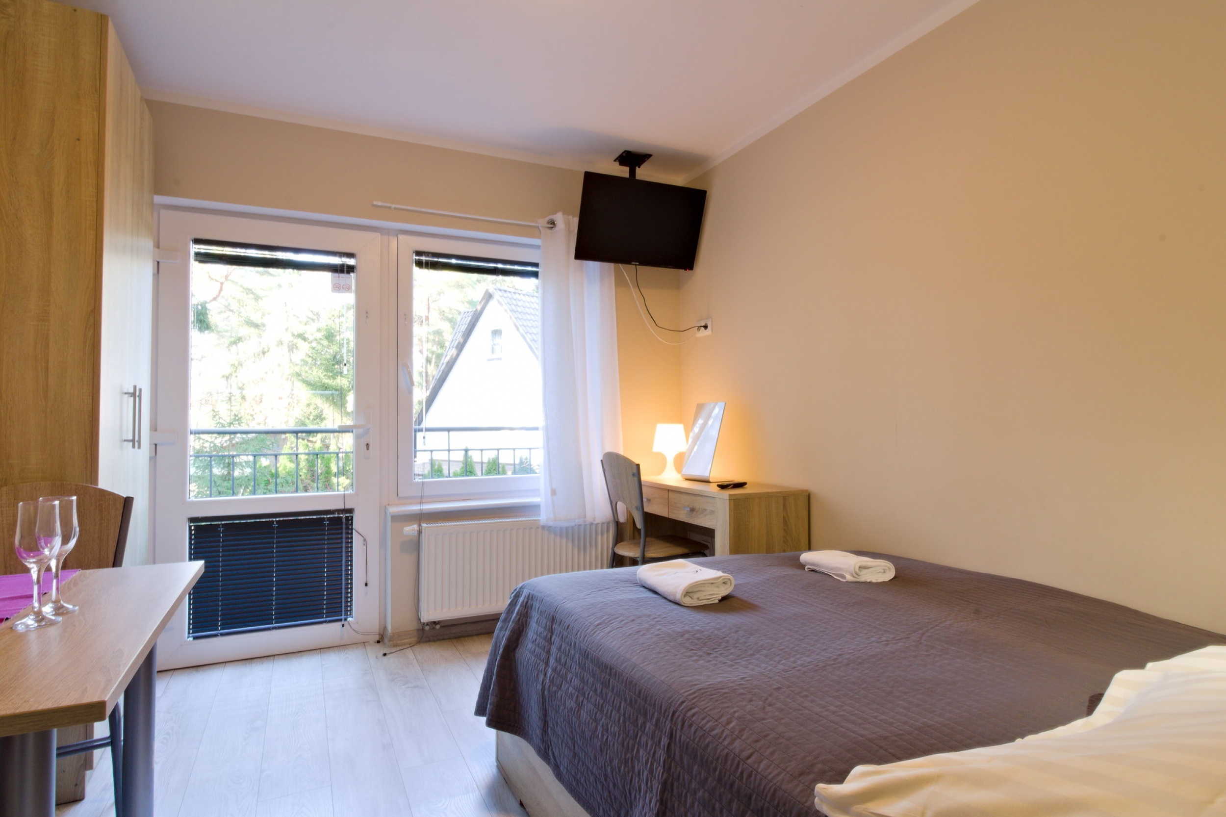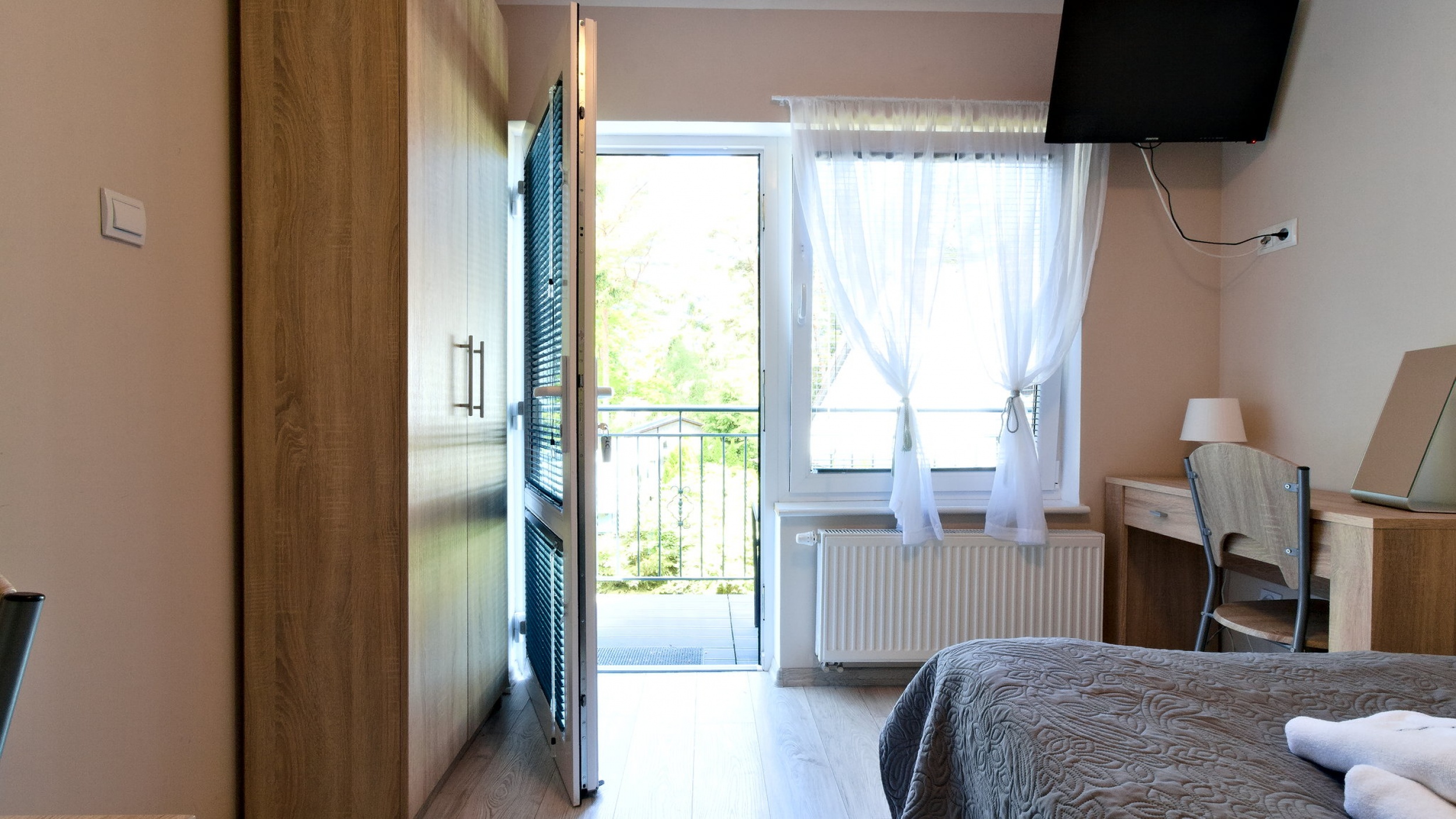 Przytulny pokój dwuosobowy zlokalizowany na pierwszym piętrze, na końcu galerii zewnętrznej budynku. Idealny dla par! W pokoju znajduje się wygodne łóżko podwójne, szafa ubraniowa oraz kącik do pracy.