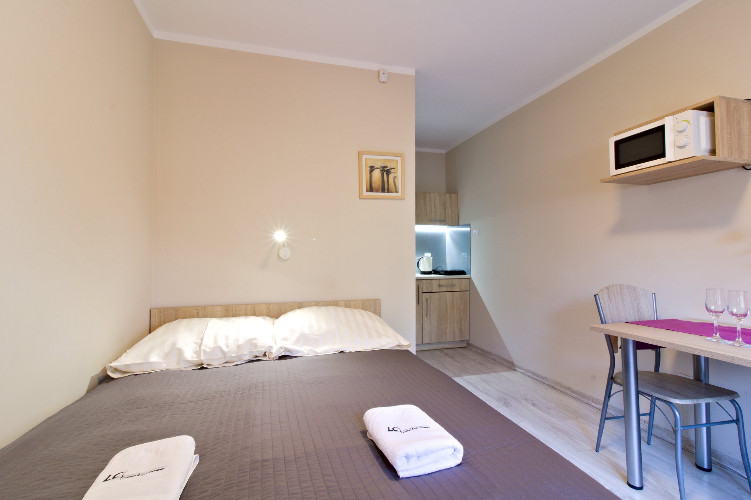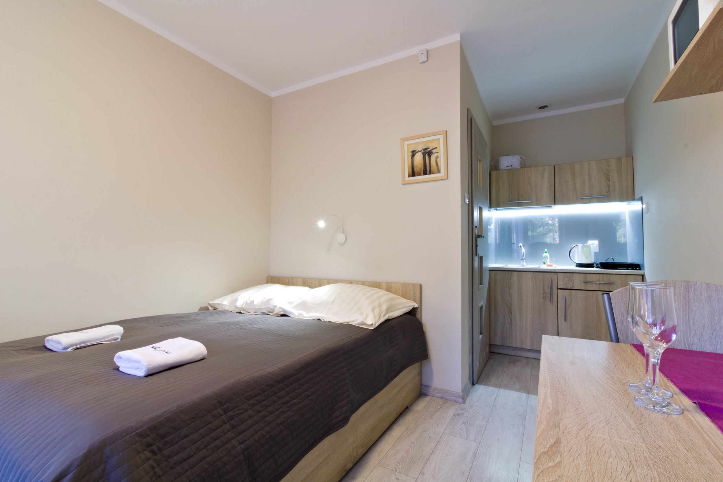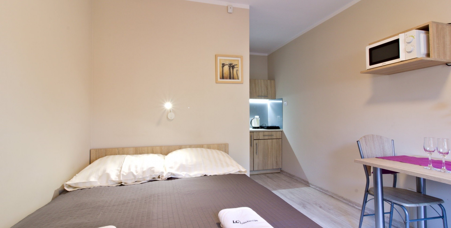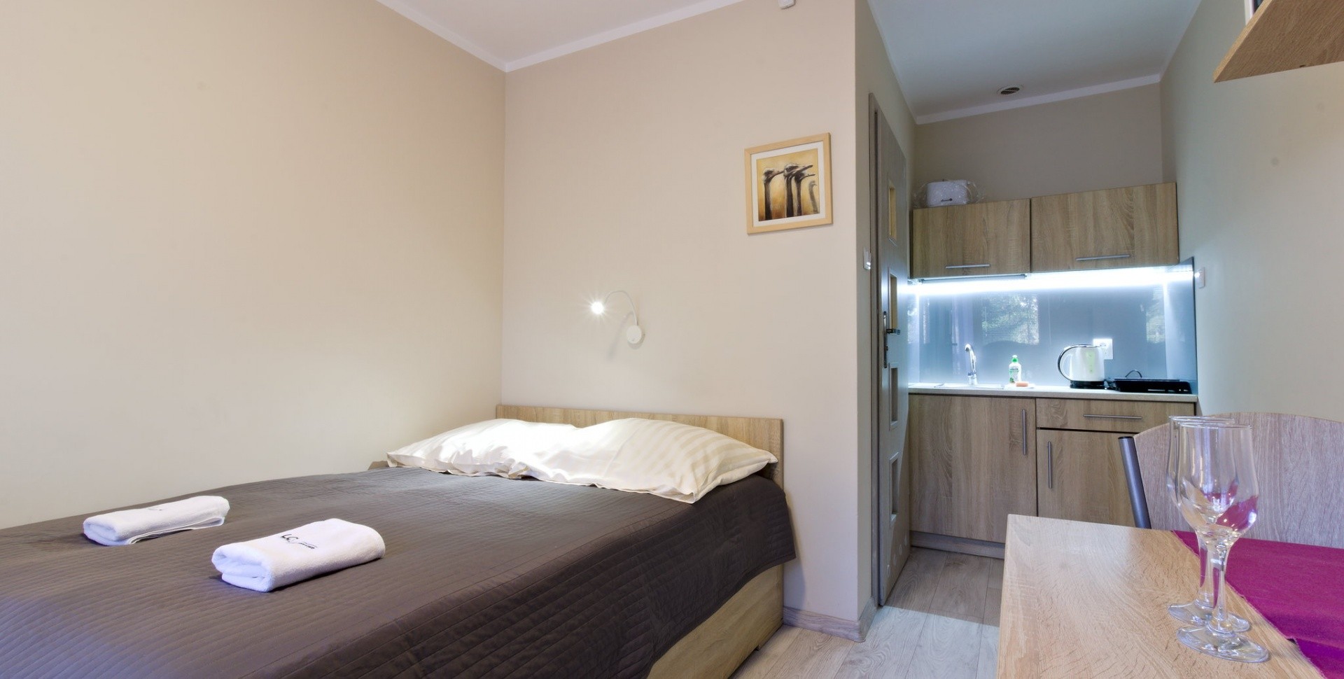 Przytulny pokój dwuosobowy zlokalizowany na pierwszym piętrze, na końcu galerii zewnętrznej budynku. Idealny dla par! W pokoju znajduje się wygodne łóżko podwójne, szafa ubraniowa oraz kącik do pracy.