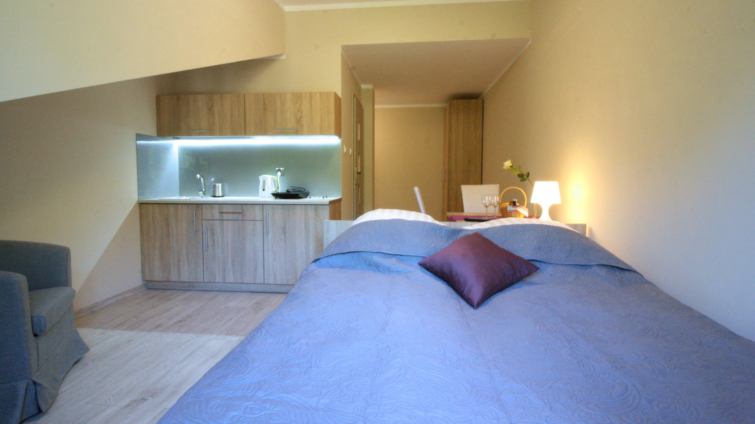 Pokój dwuosobowy zlokalizowany na drugim piętrze, skosy dachu zapewniają ciekawą architekturę, nie ograniczając przy tym funkcjonalności pokoju. Dwa łóżka pojedyncze zsunięto razem i ustawiono na wprost wyjścia na balkon z widokiem na korony drzew.