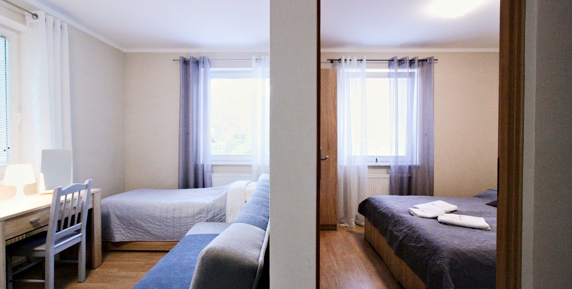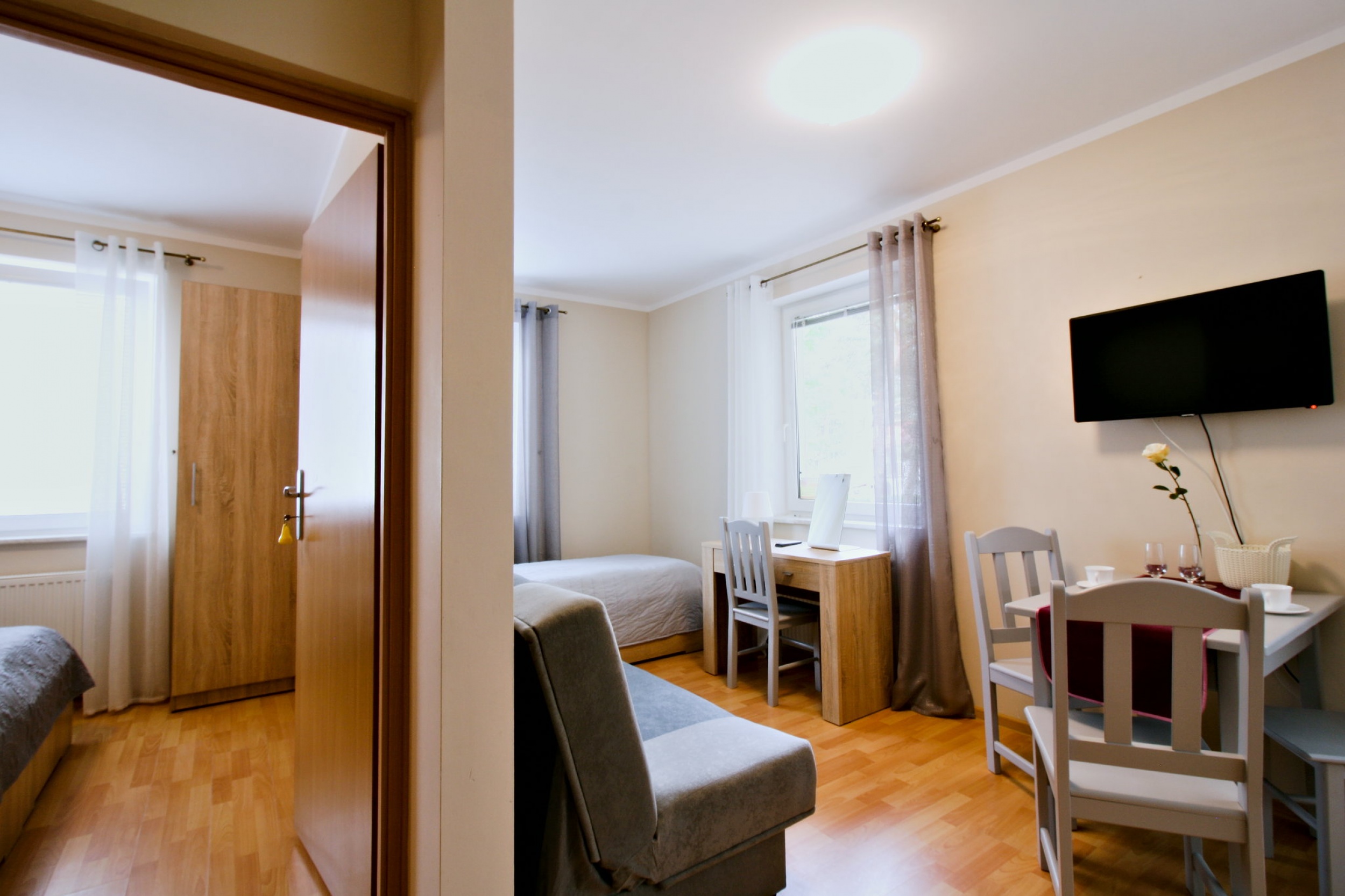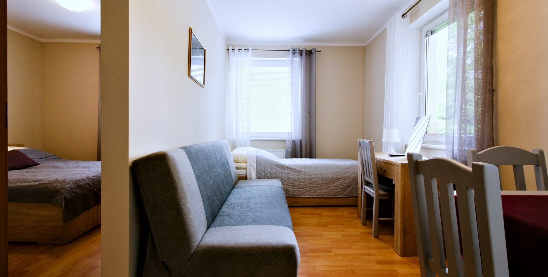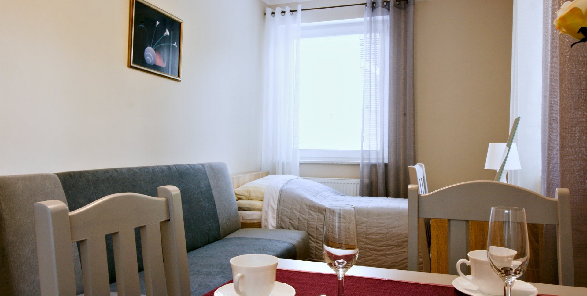 Studio z wydzieloną częścią dzienną oraz osobną sypialnią, przeznaczoną dla dwóch osób. Jeżeli potrzebujesz odrobinę więcej prywatności, to jest propozycja właśnie dla Ciebie! W części dziennej znajduje się łóżko pojedyncze oraz rozkładana sofa. W głębi części dziennej wydzielono aneks kuchenny.
