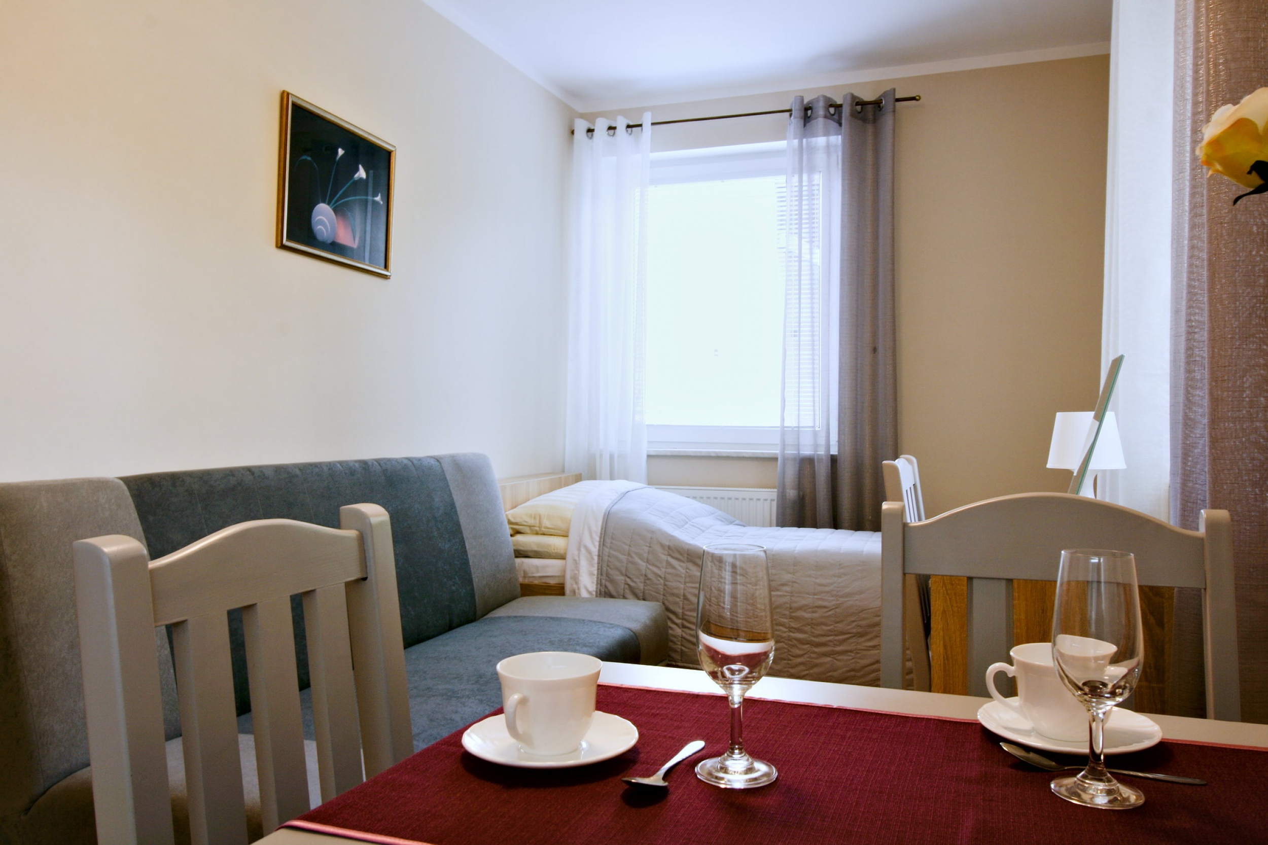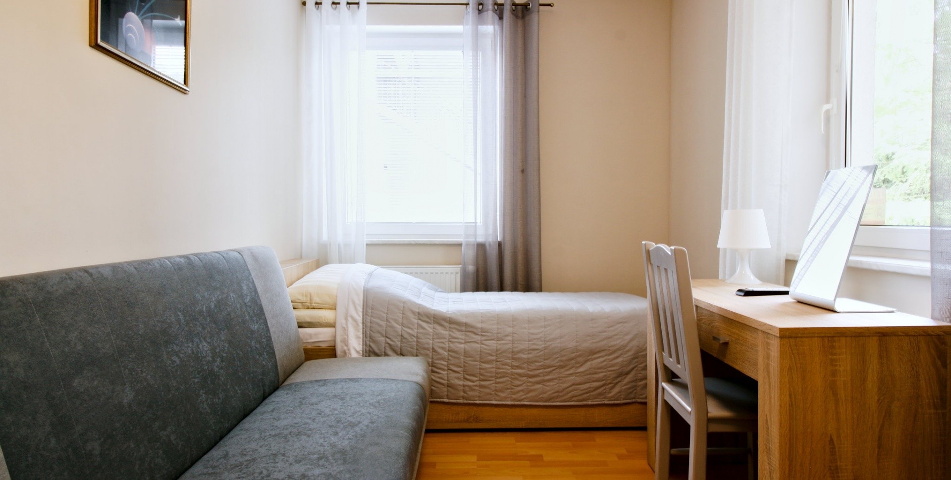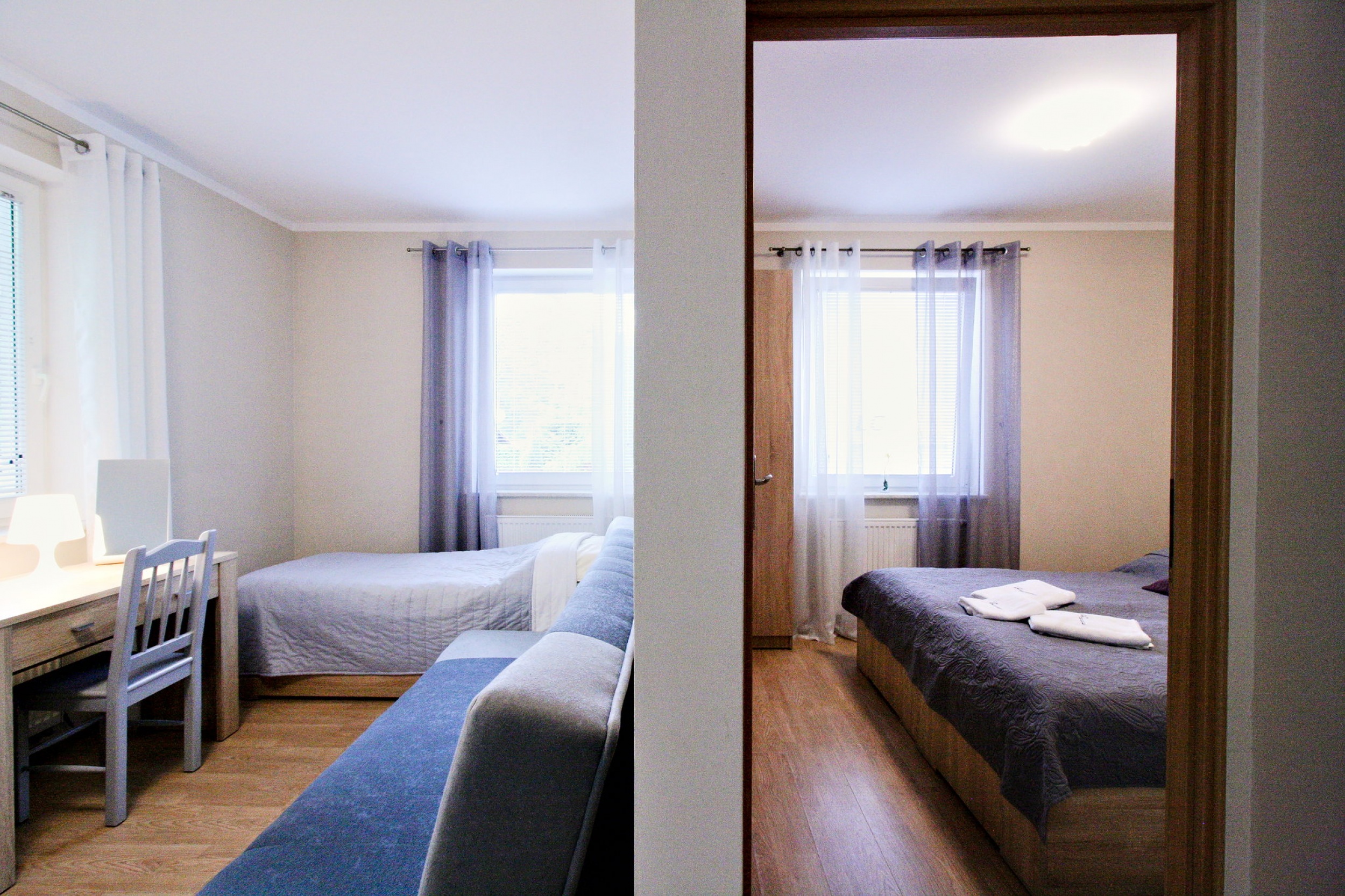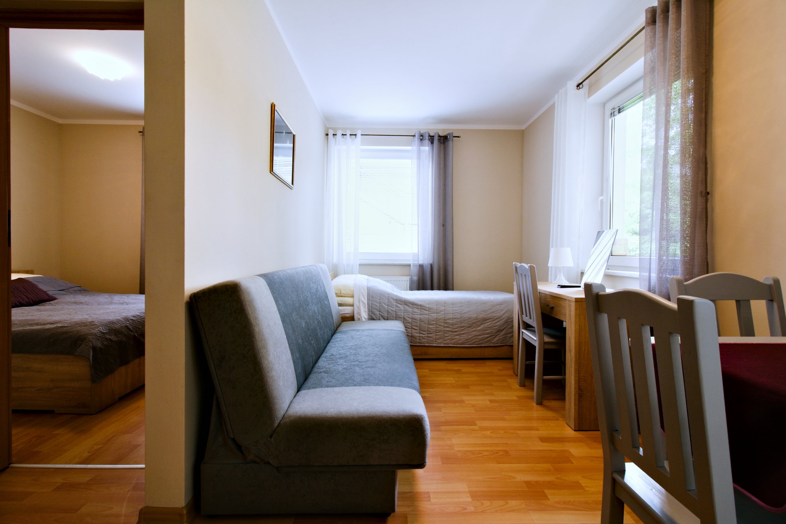 Studio z wydzieloną częścią dzienną oraz osobną sypialnią, przeznaczoną dla dwóch osób. Jeżeli potrzebujesz odrobinę więcej prywatności, to jest propozycja właśnie dla Ciebie! W części dziennej znajduje się łóżko pojedyncze oraz rozkładana sofa. W głębi części dziennej wydzielono aneks kuchenny.