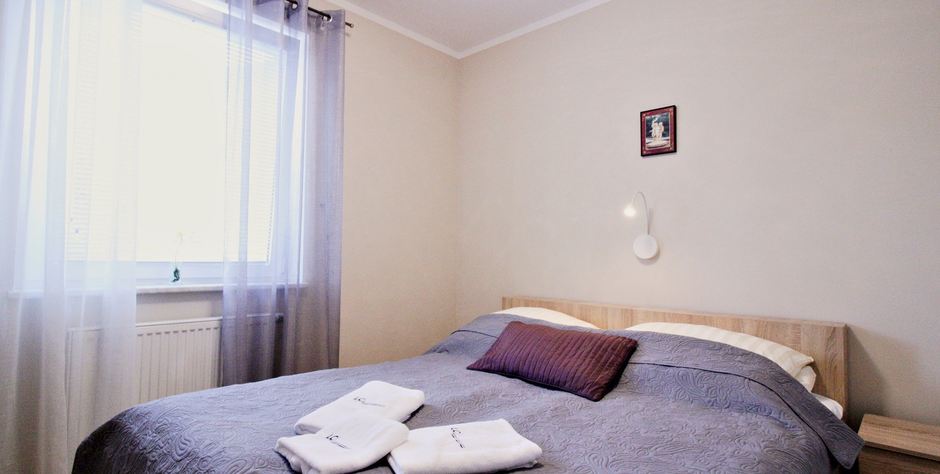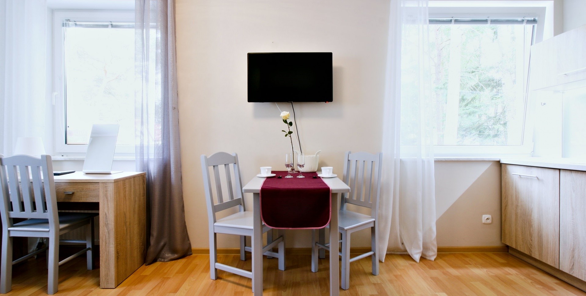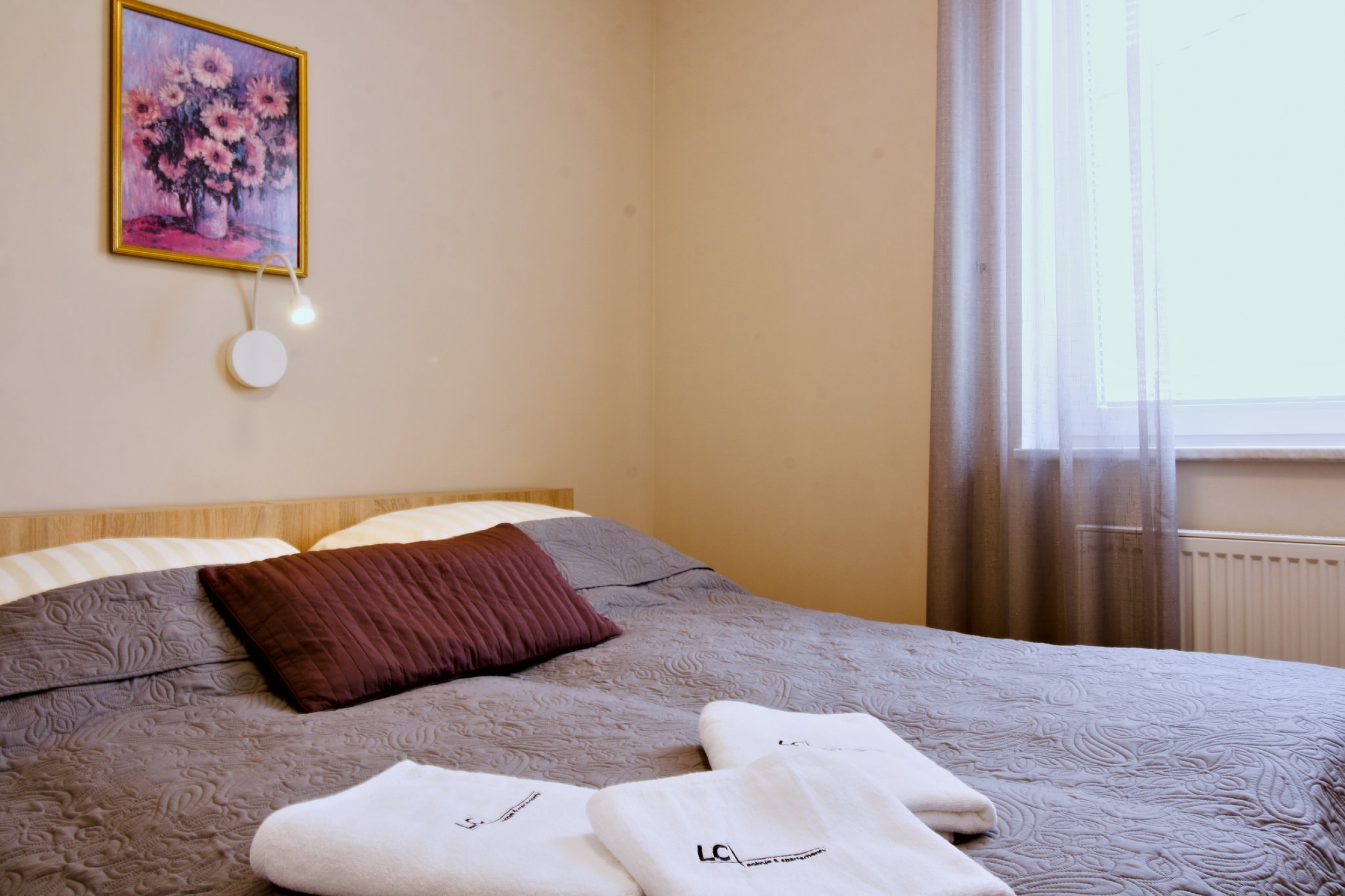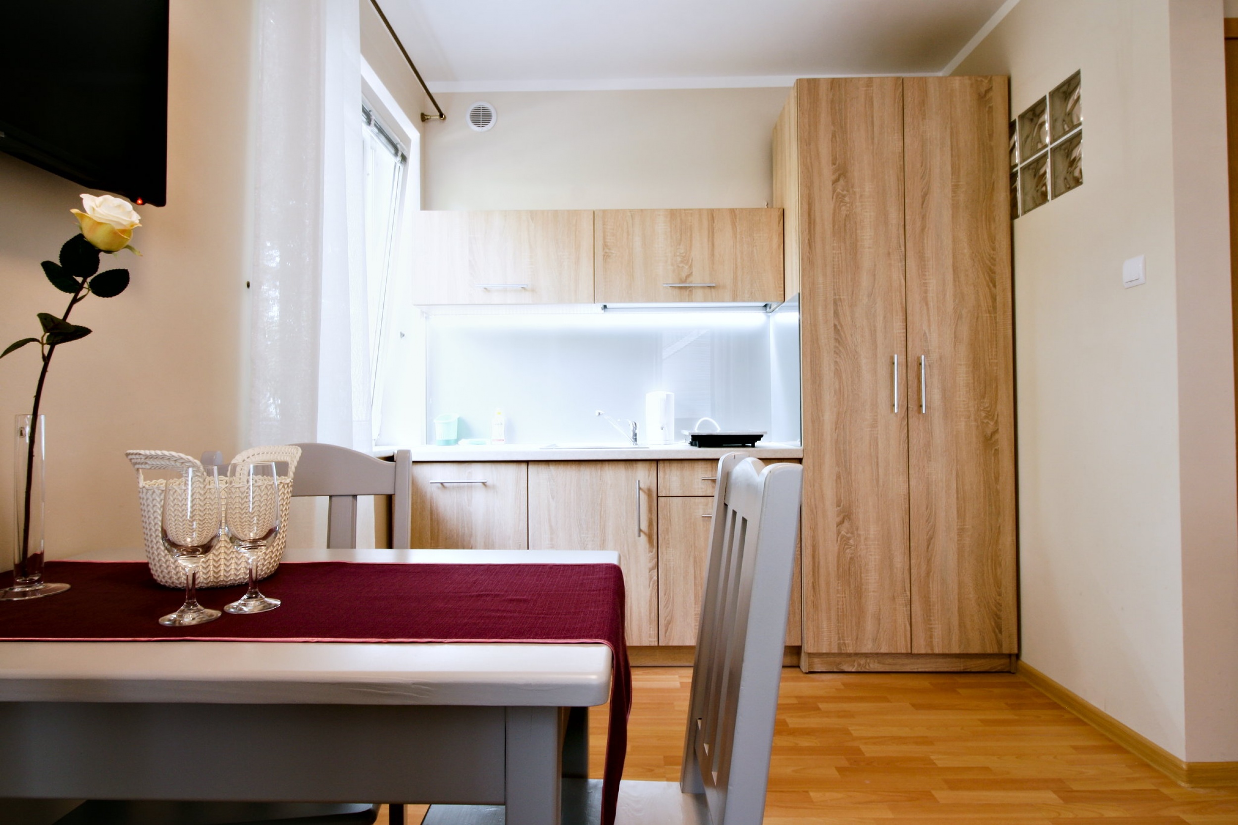 Studio z wydzieloną częścią dzienną oraz osobną sypialnią, przeznaczoną dla dwóch osób. Jeżeli potrzebujesz odrobinę więcej prywatności, to jest propozycja właśnie dla Ciebie! W części dziennej znajduje się łóżko pojedyncze oraz rozkładana sofa. W głębi części dziennej wydzielono aneks kuchenny.